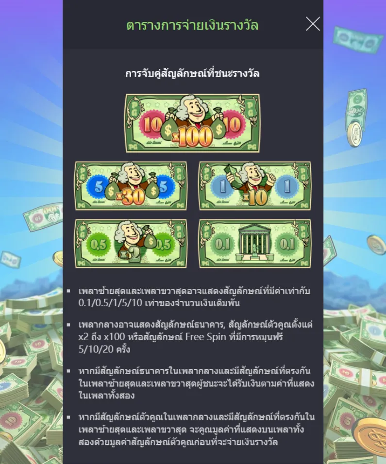 - สัญลักษณ์ ตัวคูณ ตั้งแต่ x2 จนถึง x100 ที่ช่วยทบมูลค่าให้รางวัลใหญ่ขึ้น