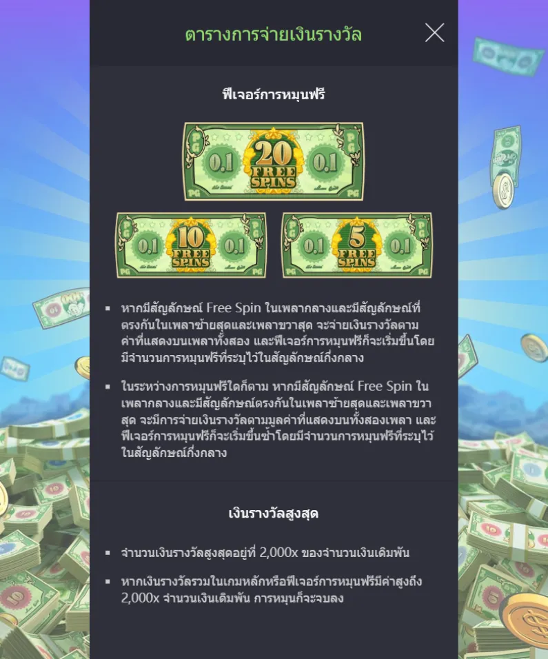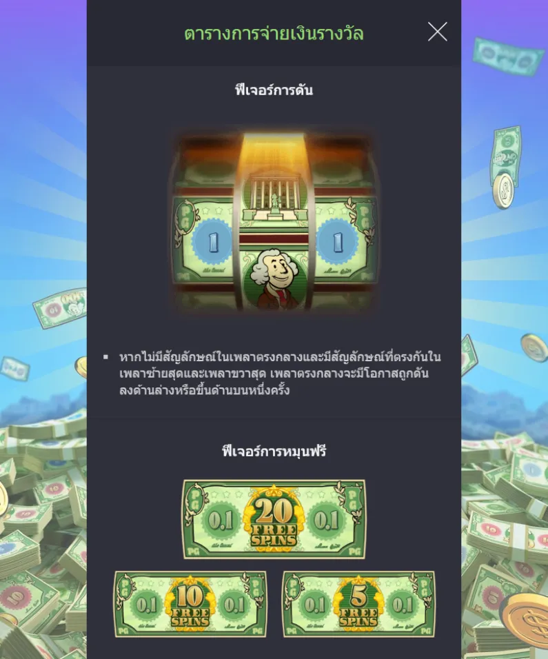 - รางวัลทั้งหมดจะแสดงเป็นเงินสดทันที และ ฟีเจอร์ฟรีสปิน จะเล่นด้วย ขนาดเดิมพันและระดับการเดิมพันเดียวกัน กับการหมุนที่ทำให้เกิดฟีเจอร์