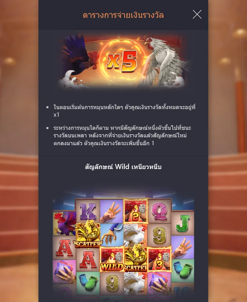 อีกจุดที่หลายคนชอบคือ ความรู้สึกของจังหวะเกม ที่เล่นแล้วไม่เบื่อ เพราะระบบคอมโบและตัวคูณทำให้ทุกสปินมีเรื่องให้ลุ้นตลอด เหมือนอยู่ในเวทีไก่ชนจริงๆ ที่เสียงเชียร์ดังสนั่นพร้อมโบนัสที่แตกกระจายทุกวินาทีอีกด้วย