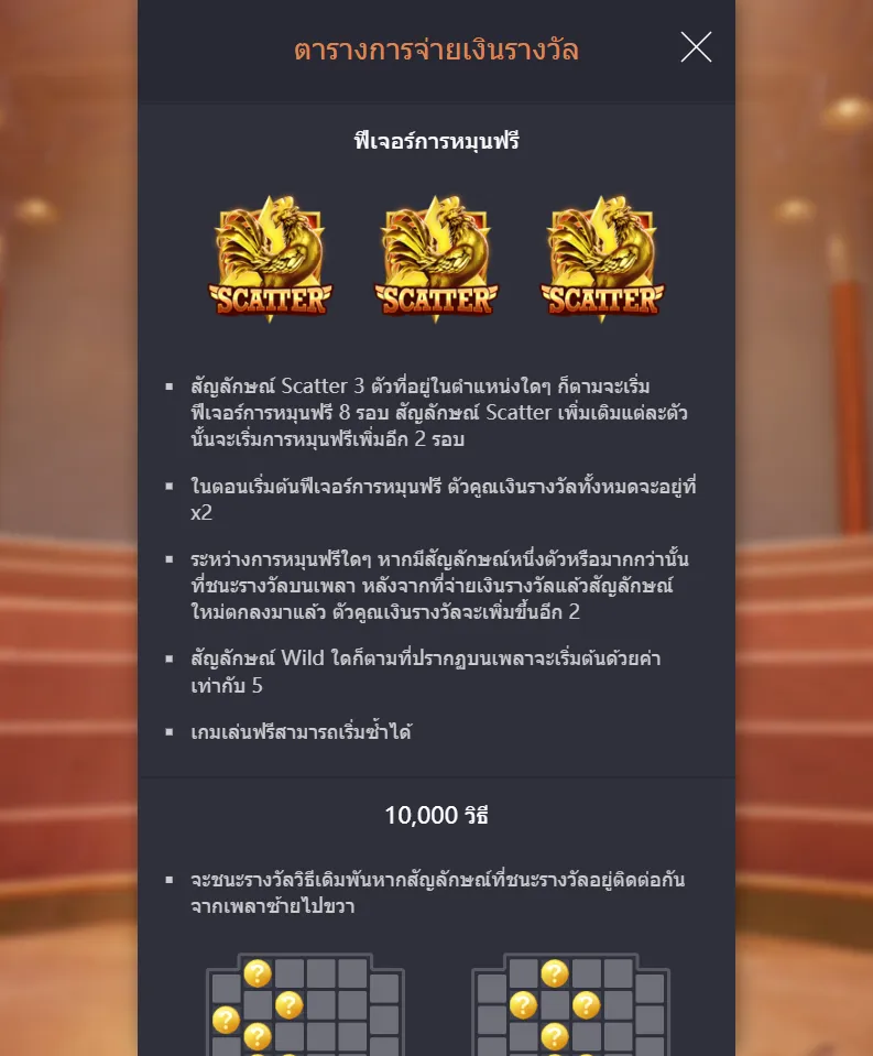 เสียงไก่ขันก้องไปทั่วอากาศ เสียงคนเชียร์ดังกระหึ่ม และพลังแห่งความหวังที่รอการปลดปล่อย นี่คือโลกของ Rooster Rumble ที่ทุกสปินเต็มไปด้วยจังหวะของการต่อสู้ และทุกครั้งที่ชนะคือการประกาศศักดาของนักเดิมพันตัวจริง!