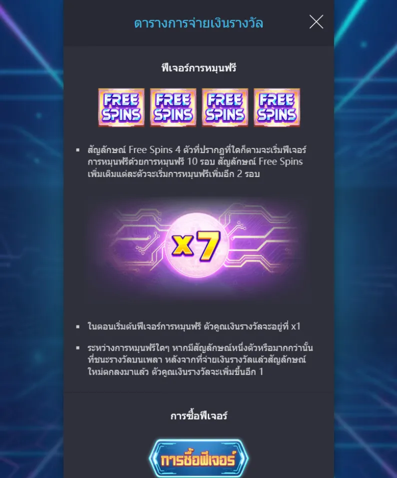 - เมื่อเริ่มฟีเจอร์หมุนฟรี ตัวคูณเงินรางวัลจะเริ่มต้นที่ x1