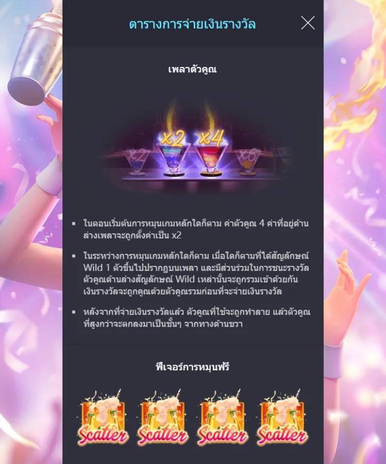 - ทุกครั้งที่สัญลักษณ์เข้าไลน์ชนะ เกมจะคำนวณรางวัลโดยอิงตามจำนวนสัญลักษณ์ที่ต่อเนื่องจากเพลาซ้ายสุดไปทางขวา ทำให้แต่ละรอบเต็มไปด้วยความลุ้น และความรู้สึกเหมือนกำลัง เขย่าค็อกเทล แห่งโชคอยู่ในมือจริงๆ