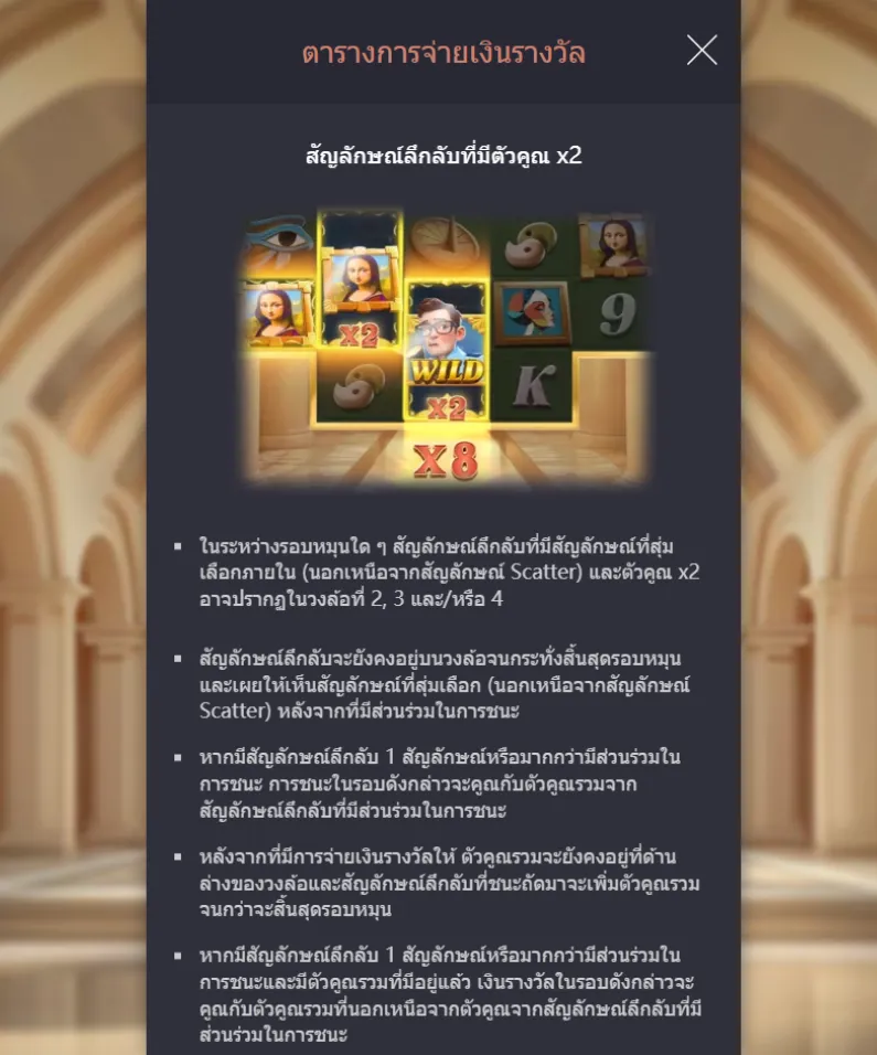 - ภายในเกม Museum Mystery นอกจากความลึกลับของบรรยากาศแล้ว สัญลักษณ์พิเศษก็เป็นอีกส่วนที่ช่วยเพิ่มความสนุกและโอกาสลุ้นรางวัลใหญ่ให้มากขึ้น