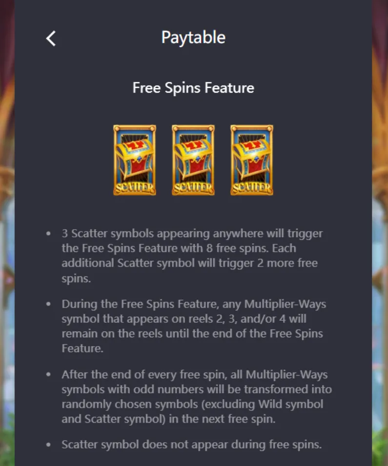 • ตลอดช่วงฟีเจอร์ฟรีสปิน สัญลักษณ์ Scatter จะไม่ปรากฏขึ้นอีก ทำให้คุณสามารถโฟกัสกับการลุ้นรางวัลจาก Multiplier-Ways และสัญลักษณ์หลักได้อย่างเต็มที่