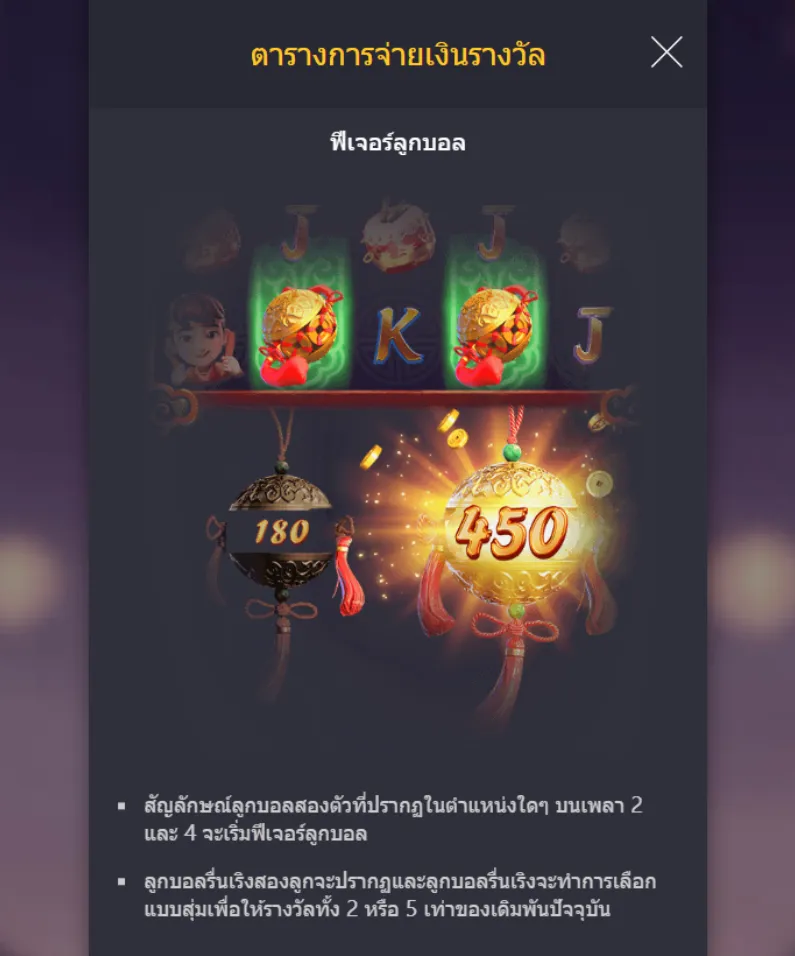 - เมื่อ สัญลักษณ์ลูกบอลจำนวน 2 ตัว ปรากฏขึ้นในตำแหน่งใดก็ได้บน เพลา 2 และเพลา 4 ฟีเจอร์ลูกบอลจะถูกเรียกใช้งานทันที บรรยากาศในเกมจะเปลี่ยนไป พร้อมเปิดโอกาสลุ้นรางวัลแบบตรงไปตรงมา