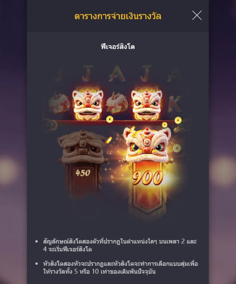 - หลังจากนั้นจะมี หัวสิงโต 2 หัว ปรากฏขึ้นบนหน้าจอ และระบบจะสุ่มเลือกหนึ่งในหัวสิงโตเพื่อมอบรางวัลให้ผู้เล่น ซึ่งรางวัลที่ได้รับจะเป็น 5 เท่าหรือ 10 เท่าของเงินเดิมพันปัจจุบัน เป็นฟีเจอร์ที่ให้ความรู้สึกได้ลุ้นจริง ทุกครั้งที่หัวสิงโตขยับ คือโอกาสที่กำไรจะพุ่งขึ้นแบบไม่ทันตั้งตัว