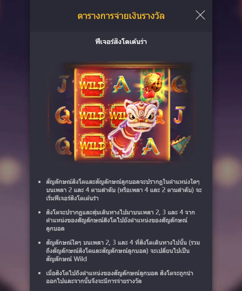 - เมื่อ สัญลักษณ์สิงโตและสัญลักษณ์ลูกบอล ปรากฏขึ้นบน เพลา 2 และเพลา 4 ไม่ว่าจะเรียงลำดับแบบใดก็ตาม ฟีเจอร์ สิงโตเต้นรำ จะเริ่มทำงานทันที เป็นหนึ่งในฟีเจอร์ที่สร้างสีสันและโอกาสทำกำไรได้สูงที่สุดของเกม