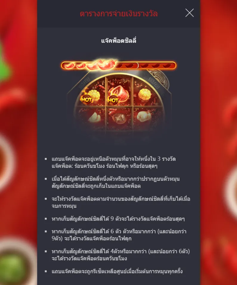 • นอกจากนี้ สัญลักษณ์พิเศษอย่าง “ชิลลี่” ยังสามารถปรากฏร่วมกับสัญลักษณ์อื่นบนเพลาได้ เพิ่มสีสันและความรู้สึกลุ้นในทุกสปิน ทำให้เกมหม้อไฟร้อนไม่ได้เดือดแค่ชื่อ แต่เดือดถึงรางวัลจริง ๆ ตั้งแต่รอบแรกที่เริ่มเล่น