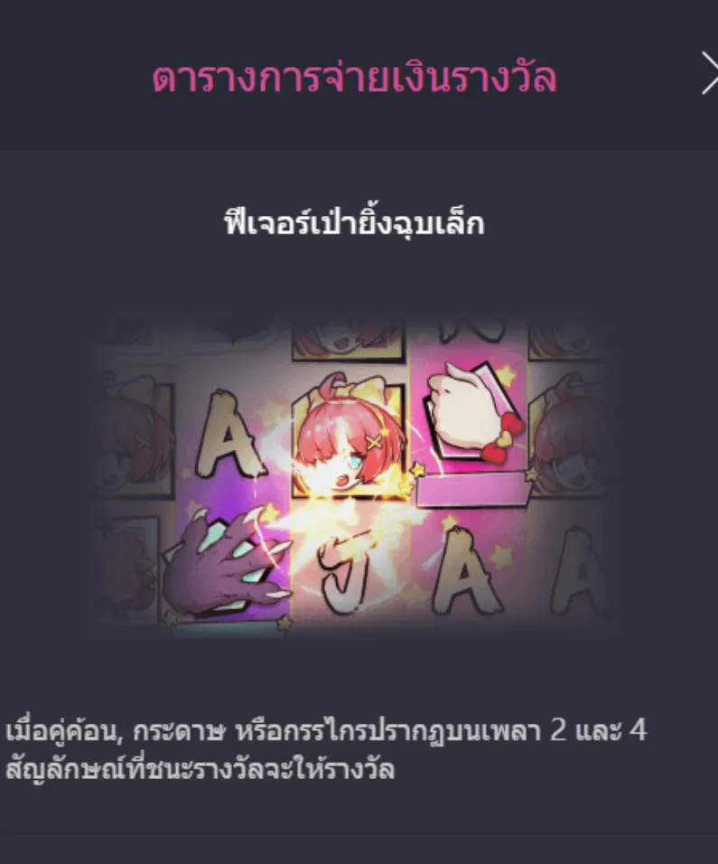 เมื่อสัญลักษณ์ค้อน กระดาษ หรือกรรไกร ปรากฏเป็นคู่ตรงกันบนเพลาที่ 2 และเพลาที่ 4 เกมจะถือว่าเข้าเงื่อนไขชนะในทันที สัญลักษณ์ที่เกี่ยวข้องจะถูกนับเป็น สัญลักษณ์ชนะรางวัล และจ่ายเงินรางวัลตามรูปแบบของเกม เพิ่มจังหวะลุ้นแบบสั้นๆ แต่ได้ใจในทุกครั้งที่สัญลักษณ์ทั้งสองตำแหน่งลงพร้อมกัน