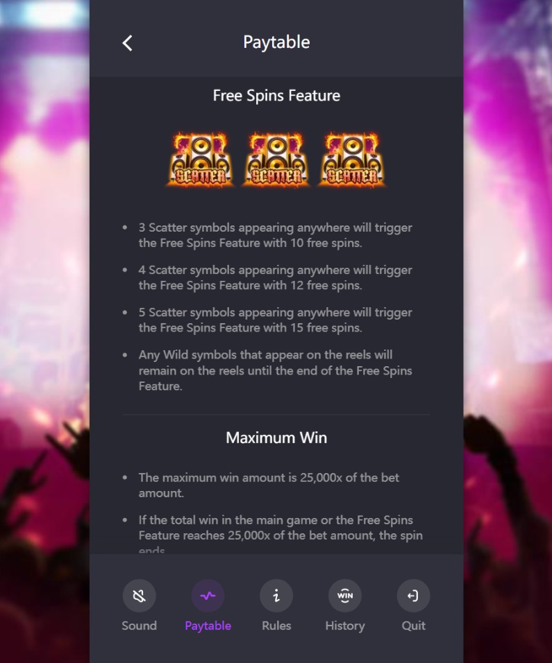 • หากยอดเงินรางวัลรวมที่ผู้เล่นได้รับ ไม่ว่าจะมาจาก รอบเกมหลักหรือฟีเจอร์พิเศษ รวมกันถึง 25,000 เท่าของเงินเดิมพัน เมื่อใด การหมุนในรอบนั้นจะ สิ้นสุดลงทันที และทำการสรุปรางวัลทั้งหมดให้ผู้เล่น